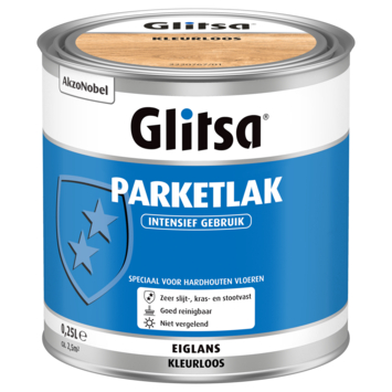 Glitsa parketlak voor intensief gebruik is een kleurloze, waterverdunbare parketlak voor binnen. Het is een slijt- en kras vaste parketlak die geschikt is voor bescherming van uw hardhouten vloeren en (lamel)parket voor normaal gebruik. Glitsa parketlak beschermt en verzorgt het hout en geeft uw vloer een prachtige kleurloze eindlaag, waarbij de houtnerf zichtbaar blijft. Het is geurarm en snel droog waardoor u Glitsa parketlak probleemloos binnenshuis kunt gebruiken. Glitsa kleurloze parketlak is niet vergelend en goed te onderhouden met Glitsa vloerreiniger en Glitsa vloerpolish, waardoor uw vloer lang mooi blijft. De inhoudsmaat is 750 ml.