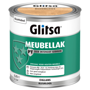 Glitsa meubellak is een kleurloze, waterverdunbare meubellak voor binnen. Het is een zeer slijt- en kras vaste meubellak geschikt voor zacht- en hardhouten tafelbladen, kasten, stoelen en andere meubelen die onbehandeld of al eerder gebeitst zijn. Glitsa meubellak beschermt uw meubelen uitstekend tegen vlekken door alcohol, koffie, thee en huishoudelijke reinigingsmiddelen. De lak is geurarm en snel droog waardoor u Glitsa meubellak probleemloos binnenshuis kunt gebruiken. Glitsa Meubellak is niet vergelend en goed reinigbaar waardoor uw meubelen lang mooi blijven. De inhoudsmaat is 250 ml.