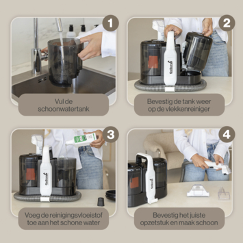 Voor optimaal gebruik voeg je schoonmaakmiddel toe door de watertank te vullen met water en het middel. Vergeet niet om de watertanks regelmatig schoon te maken en de slang goed door te spoelen. De opzetstukken kunnen eenvoudig worden gereinigd onder warm water of in de wasmachine. Voor de beste prestaties en veiligheid is het aan te raden om de handleiding goed door te lezen.