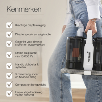 De GoScrub® biedt dieptereiniging en verwijdert vlekken tot maar liefst 6 cm diep. Het gebruiksvriendelijke dubbeltanksysteem en de directe sproei- en zuigfunctie maken het eenvoudig in gebruik. Met een krachtige zuigkracht van meer dan 15.000 Pa is deze reiniger effectief op diverse stoffen, waaronder katoen, linnen, leer en synthetische materialen. Dankzij het lange snoer van 5 meter heb je extra bewegingsvrijheid, terwijl het compacte en lichte ontwerp het gemakkelijk maakt om de reiniger op te bergen en te hanteren.