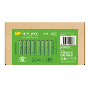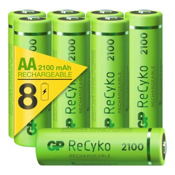 De definitie van een krachtige oplaadbare batterij? Prestaties zeggen veel. maar niet alles. Neem de ReCyko oplaadbare AA-batterij van GP. Gaat in een digitale camera 5 keer langer mee dan de GP Ultra Alkaline batterij Punt gescoord. Maar hoe is het gesteld met gebruiksgemak betrouwbaarheid en duurzaamheid? Om te beginnen is de batterij bij fabriek volledig opgeladen. Dus recht uit de verpakking klaar voor gebruik. Bij langdurige inactiviteit behoudt de batterij een jaar lang met gemak tachtig procent van zijn energie. Daar komt bij dat GP een levensduur van zes jaar garandeert of een totaal van 500 oplaadbeurten. Geen wonder dat deze populaire batterij favoriet is als krachtbron voor LED-verlichting, kinderspeelgoed, rook- en bewegingsmelders, afstandsbedieningen en zaklampen. Pak van acht stuks.