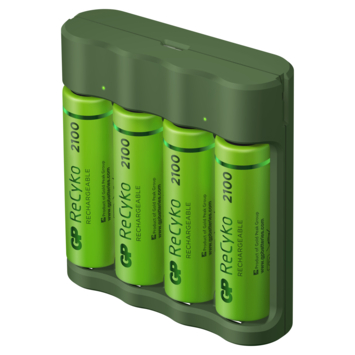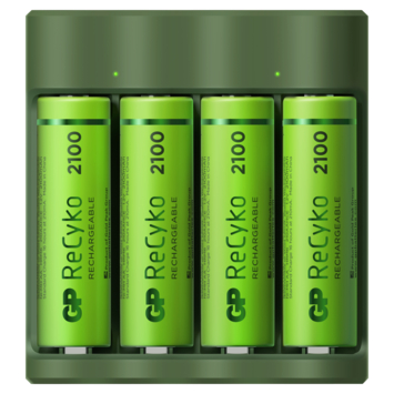 De GP oplader ReCyko incl. 4 AA batterijen is aan de achterzijde voorzien van een stekker die je eenvoudig in het stopcontact prikt. De lader is zowel geschikt voor AA-batterijen als voor AAA-batterijen. De lader heeft twee kanalen en twee LED-indicatoren. Het laden gebeurt per paar batterijen, dus je laadt twee of vier AA-batterijen tegelijkertijd, of twee of vier AAA-batterijen. De lader is compact, zodat je hem gemakkelijk meeneemt in rugzak of handtas. Je kunt direct aan de slag, want de meegeleverde AA-batterijen zijn al voorgeladen. ReCyko+ batterijen van GP zijn minimaal 300 keer opnieuw te gebruiken.
