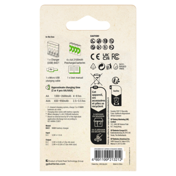 GP Batterijlader + 4x oplaadbare batterijen AA 2100mAh ReCyko + Micro USB-lader