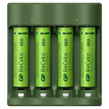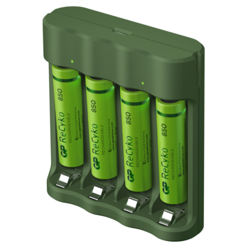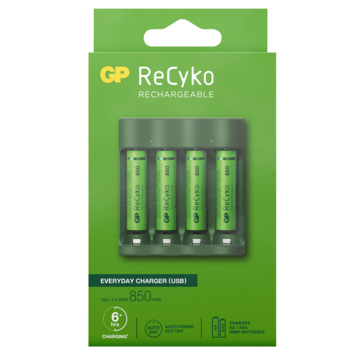 De GP oplader ReCyko incl. 4 AA batterijen is aan de achterzijde voorzien van een stekker die je eenvoudig in het stopcontact prikt. De lader is zowel geschikt voor AA-batterijen als voor AAA-batterijen. De lader heeft twee kanalen en twee LED-indicatoren. Het laden gebeurt per paar batterijen, dus je laadt twee of vier AA-batterijen tegelijkertijd, of twee of vier AAA-batterijen. De lader is compact, zodat je hem gemakkelijk meeneemt in rugzak of handtas. Je kunt direct aan de slag, want de meegeleverde AA-batterijen zijn al voorgeladen. ReCyko+ batterijen van GP zijn minimaal 300 keer opnieuw te gebruiken.
