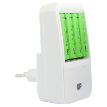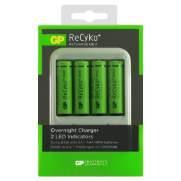 Je kunt direct aan de slag, want de meegeleverde AA-batterijen (vier stuks van 2000 milli-ampère) zijn al voorgeladen. ReCyko+ batterijen van GP zijn minimaal 300 keer opnieuw te gebruiken en hebben een lage ‘zelfontlading’. Dat houdt in dat ze na een jaar werkloos ‘rondslingeren’ nog altijd tachtig procent van hun capaciteit bezitten.