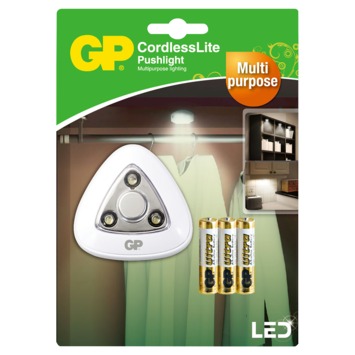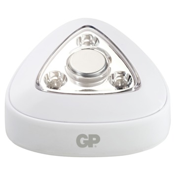 De GP Pushlight LED is een handig druklampje. U zet het lampje gemakkelijk aan en uit door op de knop te drukken. De lamp schijnt wit LED-licht. U kunt het lampje gebruiken om lades en kastjes te verlichten maar u kunt het lampje ook gemakkelijk meenemen, bijvoorbeeld voor gebruik op de camping. Het lampje is 6,7 bij 6,7 centimeter groot en werkt op 3 AAA-batterijen.