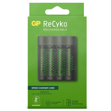 De GP ReCyko+ USB rapid batterijlader incl. 4 AA batterijen is aan de achterzijde voorzien van een stekker die je eenvoudig in het dichtstbijzijnde stopcontact stopt. De lader is zowel voor AA-batterijen geschikt als voor AAA-batterijen. De lader heeft twee kanalen en twee LED-indicatoren. Het laden gebeurt per paar batterijen, dus je laadt twee of vier AA-batterijen tegelijkertijd of twee of vier AAA-batterijen. De lader is compact, zodat je hem gemakkelijk meeneemt in rugzak of handtas. Je kunt direct aan de slag, want de meegeleverde AA-batterijen zijn al voorgeladen. ReCyko+ batterijen van GP zijn minimaal 300 keer opnieuw te gebruiken.