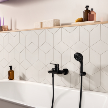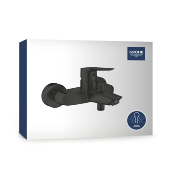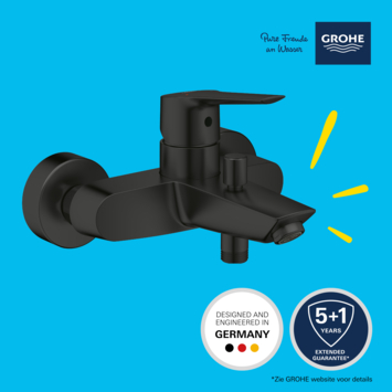De eengreeps Grohe Badmengkraan Start is eenvoudig te monteren aan de wand en biedt een soepele bediening dankzij de Grohe SilkMove keramische cartouche, waarmee je het watervolume en de temperatuur moeiteloos regelt. Voeg een Grohe handdouche naar keuze toe voor de ultieme badervaring. De automatische omsteller maakt het makkelijk om te schakelen tussen de badkraan en handdouche. Dankzij de instelbare debietbegrenzer bespaar je op je waterverbruik, terwijl de temperatuurbegrenzer je helpt energie te besparen. Een ingebouwde terugslagklep voorkomt het terugstromen van afvalwater in de watertoevoer. De duurzame Grohe Long-Life Finish beschermt de mat zwarte afwerking tegen krassen, zodat de kraan er jarenlang als nieuw uit blijft zien.