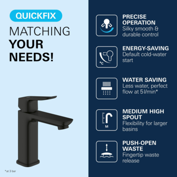 De Grohe Dice wastafelmengkraan M-Size Push open - Mat Zwart combineert geavanceerde technologie met een strak ontwerp, waardoor het de ideale keuze is voor elke moderne badkamer. Deze kraan is voorzien van de SilkMove technologie, waarmee je met gemak de watertemperatuur en -stroom regelt. Dankzij de energiebesparende Energy Saving functie start de kraan altijd met koud water, wat bijdraagt aan lagere energiekosten. Daarnaast zorgt de Water Saving technologie voor een waterbesparende werking zonder in te boeten op prestaties, met een maximale doorstroming van 5 l/min bij 3 bar.