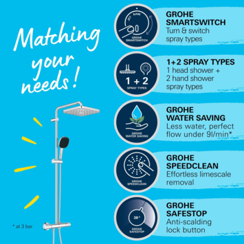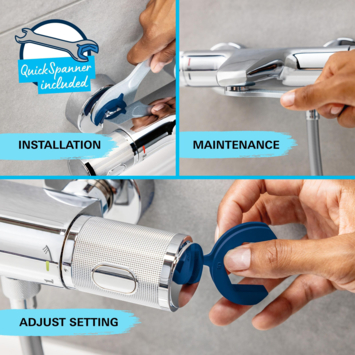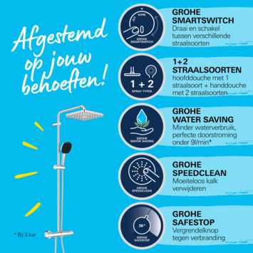De SpeedClean technologie maakt kalkverwijdering een fluitje van een cent, terwijl de Grohe TurboStat-technologie zorgt voor een constante watertemperatuur zonder verrassingen. Veiligheid wordt gegarandeerd met de Grohe SafeStop temperatuurbegrenzer die is ingesteld op 38°C, ideaal voor gezinnen met kinderen. Met de Grohe SafeStop Plus kun je de limiet instellen op 43°C voor extra bescherming. Schakel eenvoudig tussen de hoofd- en handdouche en pas het watervolume aan met de AquaDimmer-functie. De duurzame Grohe StarLight chroomafwerking zorgt ervoor dat het douchesysteem er jarenlang als nieuw uitziet. Het Grohe Vitalio Comfort 250 thermostatische douchesysteem is de ideale keuze voor wie comfort, veiligheid en stijl zoekt in de badkamer.