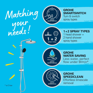 Het Grohe Vitalio Start 250 douchesysteem met omstelling bevat een hoofd- en handdouche, een douchestang met douchearm, een verstelbaar glijelement voor de handdouche en een TwistFree doucheslang. De hoofddouche biedt de keuze tussen de zachte Rain Spray en de waterbesparende SmartRain Spray, die je eenvoudig activeert met de omstelling. Kies uit twee verschillende straalsoorten voor een volledig gepersonaliseerd douchemoment. Dankzij Grohe DropStop voorkom je nadruppelen na het douchen. De handdouche levert een zachte Rain Spray en is voorzien van een ShockProof siliconenring voor extra bescherming. Beide douches zijn uitgerust met Grohe EcoJoy technologie, wat zorgt voor minder waterverbruik zonder in te boeten op comfort. Grohe DreamSpray zorgt voor een gelijkmatige waterverdeling over alle sproeigaatjes, zodat je optimaal van je douche geniet. Dankzij de SpeedClean technologie zijn de sproeigaatjes gemakkelijk kalkvrij te maken met een simpele veeg. De duurzame Grohe StarLight afwerking behoudt de krasvrije chroomglans. Dankzij de flexibele installatie en eenvoudige aansluiting is het douchesysteem compatibel met je bestaande douchekraan, waardoor je snel kunt upgraden.