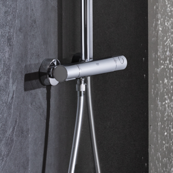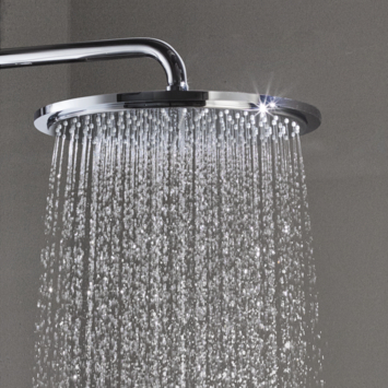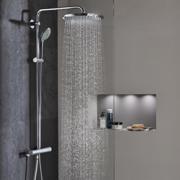 Met zijn royale hoofddouche voegt het GROHE Euphoria XXL douchesysteem in chroom direct design en prestatie toe aan elke badkamer. Het zit boordevol GROHE's Duitse innovatieve technologie. Stel de gewenste temperatuur in met GROHE TurboStat en het water blijft een constante druk behouden, zelfs als de toevoer fluctueert. GROHE EcoJoy vermindert het waterverbruik maar garandeert ook een complete douche-ervaring. De makkelijk te gebruiken GROHE SafeStop-functie beperkt de watertemperatuur tot maximaal 38°C – waardoor deze ideaal is om kinderen hun gang te laten gaan in de badkamer - maar kan voor volwassenen hoger worden ingesteld. De GROHE DreamSpray zorgt ervoor dat de waterstroom uit elk sproeigaatje gelijk is – waardoor deze perfect is voor de indrukwekkende Rainshower Cosmopolitan 310 mm hoofddouche's zachte PureRain Spray. De arm van de hoofddouche draait zelfs 180° voor extra veelzijdigheid. De Euphoria 110 mm Massage handdouche heeft drie straalsoorten die je kan aanpassen aan jouw stemming: een rustgevende Rain spray, de milieuvriendelijke Smart Rain Spray met verminderd waterverbruik en de revitaliserende Massage Spray. De handige siliconen SpeedClean- sproeigaatjes zijn gemakkelijk schoon te houden waardoor je vuil en kalk zo kan verwijderen. De DropStop is een geweldige functie dat nadruppelen van de horizontale hoofddouche voorkomt zodra de douche uit is. Tot slot is de GROHE StarLight coating uitzonderlijk duurzaam en blijft die er jaren goed uitzien.
