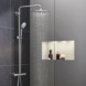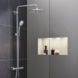 Met het indrukwekkende waterbesparende GROHE Euphoria 260 Douchesysteem met thermostaat voeg je meteen design en genot toe aan je badkamer. Dit systeem zit ook vol met de geavanceerde technologie van GROHE. Hiermee ben je gegarandeerd voorzien van topprestaties. Stel je gewenste temperatuur in met GROHE TurboStat en het water blijft op temperatuur, ook als de watertoevoer schommelt. De eenvoudige SafeStop knop beperkt de temperatuur tot maximaal 38°C – ideaal als je kinderen alleen douchen – maar dit kan hoger gezet worden voor volwassenen. Met de Aquadimmer pas je moeiteloos het volume van de waterstraal aan en schakel je eenvoudig tussen de hoofd- en handdouche, die voorzien zijn van een 1750mm Twistfree slang. GROHE EcoJoy beperkt het waterverbruik tot 9,5 l/min maar geeft je wel gegarandeerd een complete douche-ervaring en de GROHE DreamSpray verdeelt het water gelijkmatig over alle sproeigaatjes. De 260mm hoofddouche beschikt over drie verschillende stralen. De Jet straal is krachtig en geconcentreerd waardoor hij perfect is om je haar uit te spoelen en voor een stimulerende hoofd- of nekmassage. SmartRain is een bredere straal en zorgt voor een stimulerende, maar tegelijkertijd ontspannende ervaring. De Rain straal maakt gebruik van alle sproeigaatjes van de royale douchekop voor een verzachtende douche waarbij je lichaam volledig wordt ondergedompeld met water. Om de gewenste straal te kiezen hoef je alleen maar aan de knop te draaien die zich in het midden van de douchekop bevindt. En de 450mm douchearm van de hoofddouche draait zelfs 180º voor extra flexibiliteit. De 110mm handdouche beschikt ook over drie stralen: de zachte Rain, de waterbesparende SmartRain en de krachtige Massage straal. De handige siliconen SpeedClean sproeigaatjes kunnen eenvoudig vrij gehouden worden van vuil en kalk! De krasbestendige, glanzende GROHE StarLight chroomlaag gaat jarenlang mee en de InnerWater Guide voorkomt dat het oppervlak van de douche te heet wordt. Het GROHE Euphoria 260 douchesysteem – in alle opzichten een perfecte douche!