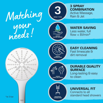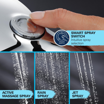 Witte sproeiplaat GROHE Rain met DripStop, Jet met DripStop, ActiveMassage GROHE EcoJoy 9,5 l/min. Doorstroombegrenzer GROHE DreamSpray voor een optimaal straalbeeld GROHE SmartTip kies de gewenste straalsoort met een enkele tip GROHE RainStart