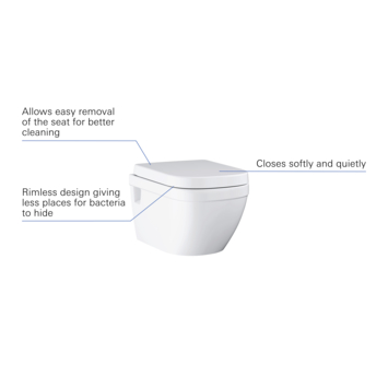 De Grohe Wandcloset Ceramic is keramische toiletpot in D-vorm. Ontworpen met een ingetogen stijl en strakke lijnen wordt deze aan de wand te monteren wc geleverd met een zitting en klep met de gezinsvriendelijke soft close-functie die ervoor zorgt dat ze langzaam en soepel bewegen, waardoor klepperende geluiden worden vermeden en kinderen niet bekneld raken met hun vingers. De snelontgrendelingsfunctie van de zitting maakt het schoonmaken van elke hoek van het keramiek gemakkelijk - de zitting is met een scharnier bevestigd dat snel kan worden losgemaakt. Het onderhoudsvriendelijke randloze ontwerp van de wc zorgt ervoor dat ziektekiemen zich nergens kunnen verbergen en garandeert verbeterde spoelprestaties. Het toilet heeft een horizontale afvoer en een spoelvolume van 6/3 l.