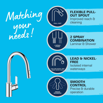 De GROHE keukenkraan Get met hendel Chroom is een praktische keukenkraan met hendelbediening. Dankzij de GROHE SilkMove keramische schijven draai je de hendel soepel met 1 hand vooraf naar de gewenste watertemperatuur en naar de juiste waterstraal. Keramische schijven zijn duurzaam en vergen bovendien weinig onderhoud. De keukenkraan is laag met 15,2 cm, maar doordat je de uitloop 140° kan draaien, maak je toch snel wat ruimte in je gootsteen. De waterstroom kun je beperken door bij de installatie de doorstroombegrenzer in te stellen. Daarmee bespaar je op je waterverbruik. De kraan is afgewerkt met de GROHE StarLight chroomlaag, die krasbestendiger is dan reguliere chroomlagen. Installeren doe je eenvoudig en snel met de meegeleverde flexibele aansluitslangen, bevestigingsmateriaal en het QuickFix snelmontagesysteem, waarvoor je maar 1 gat hoeft te boren voor de montage. Met de tijdloze vormgeving past deze kraan altijd in jouw keukeninterieur. Kies je voor deze kraan, dan krijg je 5 jaar garantie en geniet je bovendien van een praktische kraan van hoge kwaliteit voor een betaalbare prijs!