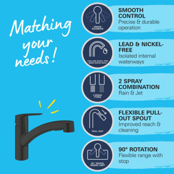 Kies voor de Grohe Start QuickFix Keukenmengkraan voor een kraan die zowel qua design als functionaliteit uitblinkt in je keuken.