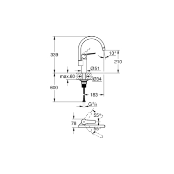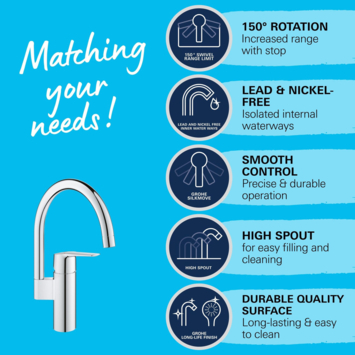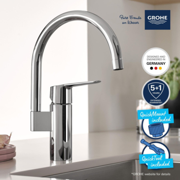 Modern qua zowel vorm als functionaliteit, voeg je met onze QuickFix bestseller veelzijdigheid en prestaties toe aan je huis - de vernieuwde GROHE Start eengreeps keukenkraan met hoge C-uitloop is van alle markten thuis. Deze klassieker is omgebouwd om te kunnen voldoen aan de eisen van moderne keukens, met een slank, hedendaags profiel en een 35% hogere uitloop die soepel 150° kan draaien voor meer flexibiliteit en gemak. In de kraan zelf biedt de GROHE SilkMove cartouche- technologie voor een soepele en nauwkeurige bediening. GROHE Zero geïsoleerde binnenwateren zorgen ervoor dat je drinkwater lood- en nikkelvrij is. Een instelbare doorstroombegrenzer bespaart water en geld, terwijl een geïntegreerde temperatuurbegrenzer verbranding aan heet water helpt voorkomen. De glanzende GROHE StarLight chromen afwerking is slijtvast en heeft een schitterend oppervlak dat lang meegaat. Ontworpen voor eengatsinstallatie en inclusief QuickGuide en QuickVideo die je vindt via de te scannen QR-code. Daanraast kan met het gereedschapsloze QuickMount-systeem de kraan snel worden gemonteerd. Voor deze kraan wordt een druk van minimaal 1,0 bar aanbevolen.