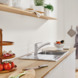De GROHE keukenkraan Start met hendel en uittrekbare uitloop RVS is een hele handige hulp in de keuken. De uitloop is 90° draaibaar wat het handig maakt als je bijvoorbeeld een hoge pan in de gootsteen wilt zetten. En heb je veel vaat af te spoelen? Dan trek je eenvoudig het gedeelte met de sproeikop uit het EasyDock systeem. Zo bereik je alle hoekjes van de gootsteen wat de kraan erg flexibel in gebruik maakt. Met de sproeikop heb je bovendien de keuze om een gewone straal in te stellen of een douchestraal: het knopje aan de onderkant van de uitloop zet je eenvoudig om. De sproeikop zelf heeft SpeedClean siliconen nopjes waar je kalk snel met je vingers vanaf kan vegen. De SilkMove keramische schijven maken het draaien van de hendel soepel en nauwkeurig en deze vergen nauwelijks onderhoud. Ook de geborstelde RVS afwerking is onderhoudsvriendelijk en bovendien krasvast. De GROHE Zero kraan is lood en nikkelvrij, dat is goed voor je gezondheid. Met het vereenvoudigde snelmontagesysteem QuickFix monteer je deze kraan heel makkelijk zelf met de bijgeleverde materialen. Een multifunctionele kraan in een tijdloos ontwerp, dat is wat deze kraan zo uniek maakt! Besluit je deze kraan te kopen? Dan profiteer je ook van 5 jaar fabrieksgarantie.