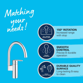 De Grohe Keukenkraan Wave Cosmopolitan met Hendel en C-uitloop Chroom biedt maximaal comfort dankzij de hoge, draaibare uitloop. Hierdoor is het makkelijker om bijv. een pan of een emmer onder de kraan te plaatsen. Het moderne design past in bijna iedere keuken. Dit model kun je makkelijk bedienen met een solide metalen greep en is voorzien van GROHE SilkMove® voor een comfortabele en nauwkeurige bediening. Makkelijk schoon te maken, omdat de behuizing uit 1 geheel bestaat. Eenvoudig te installeren dankzij de flexibele aansluitslangen en het snelmontagesysteem. Blijft er jarenlang als nieuw uitzien door de chroomafwerking die vuilafstotend en krasbestendig is.