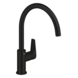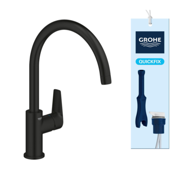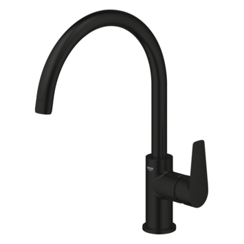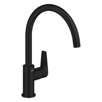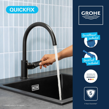 De GROHE Start Edge hoge keukenmengkraan in mat zwart combineert elegant design met praktische functionaliteit. De C-vormige uitloop biedt genoeg ruimte voor hoge pannen en draait 360° zodat je volledige bewegingsvrijheid hebt. Dankzij de voelbare hendel kun je de waterstroom en temperatuur eenvoudig en nauwkeurig instellen.