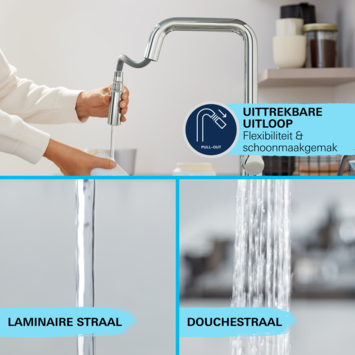 De hoge, draaibare en uittrekbare uitloop met een voorsprong van 21,5 cm maakt deze kraan uiterst praktisch. Of het nu gaat om het vullen van grote pannen of het spoelen van groenten, de kraan biedt maximale flexibiliteit en gebruiksgemak. De gesloten ergonomische greep zorgt voor een comfortabele bediening, zodat dagelijkse taken in de keuken moeiteloos verlopen.