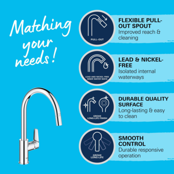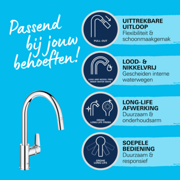Gemaakt van hoogwaardige materialen, staat de Grohe Start Edge keukenkraan garant voor betrouwbaarheid. De slijtvaste chroomafwerking blijft jarenlang glanzen en is eenvoudig schoon te maken, wat zorgt voor een langdurig mooie uitstraling.