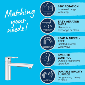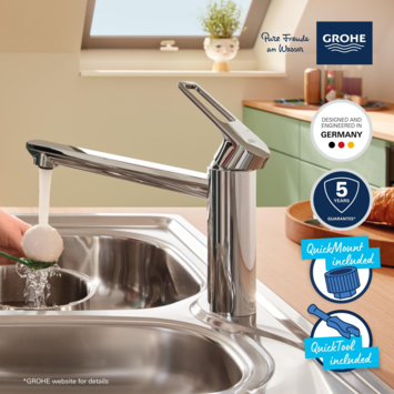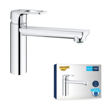 De kraan is bovendien bijzonder gebruiksvriendelijk: de mousseur is eenvoudig los te schroeven met een muntje, ideaal voor het vervangen of schoonmaken van de kraan. Dankzij Grohe Zero technologie komt het water in de kraan nooit in contact met lood of nikkel, waardoor je altijd fris en schoon water hebt. De Grohe Long-Life Shine-coating zorgt ervoor dat de kraan krasbestendig is en altijd een stralende, schone uitstraling heeft, die je met een droge doek eenvoudig onderhoudt.