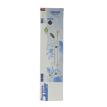 De GROHE Precision Joy renovatieset 150 mm bestaat uit de Precision Joy douchethermostaatkraan 150 mm en Vitalio doucheset Joy 2 SprayDimmer. De GROHE Precision Joy douchethermostaatkraan 150 mm is geschikt voor moderne badkamers waar de hart-op-hart afstand tussen de koud- en warmwaterleiding 150 mm is. Deze thermostatische douchekraan zorgt voor een heerlijke douche met een constante watertemperatuur, ook al zijn er fluctuaties in de waterdruk. Met de SafeStop knop op 38°C voorkom je dat je kinderen de temperatuur verhogen, terwijl je dankzij de volumegreep met GROHE EcoButton tot 50% water kunt besparen. De kraan is voorzien van GROHE TurboStat: hiermee wordt snel en continu de gewenste temperatuur bereikt. De GROHE Vitalio doucheset Joy 2 SprayDimmer bestaat uit een Vitalio handdouche Joy 2 SprayDimmer, Vitalio Trend glijstang 700 mm en Vitalioflex doucheslang Trend 1750 mm. De glijstang kan eenvoudig worden geplaatst op bestaande boorgaten. De GROHE Vitalio Joy 2 SprayDimmer handdouche in de kleur Grijs heeft een diameter van 110 mm en is voorzien van twee straalsoorten. Bij de GROHE Rain straal geven fijne regenstraaltjes het effect van een zomerse regenbui op je lichaam. Bij de GROHE Massage straal zorgen pulserende waterstoten voor een aangenaam tintelende ervaring. Met de SmartRain straal, die wordt geproduceerd door de SprayDimmer op de handdouche, kun je het waterverbruik met maximaal 40% verminderen. Tegelijk zorgt GROHE DreamSpray® technologie voor een perfecte verdeling van het water.