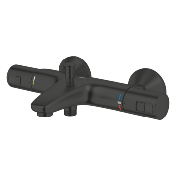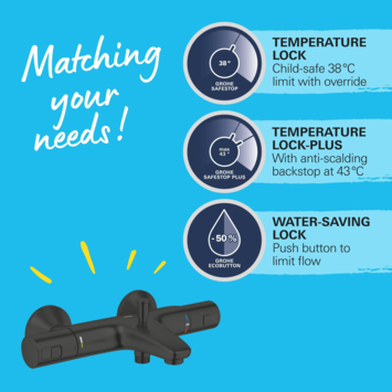 De GROHE Precision Start thermostatische badmengkraan in Matte Black (mat zwart) wordt geleverd met duurzame veiligheidsfuncties en een gebruiksvriendelijke bediening. Uitgevoerd in een slank design is deze wandmengkraan perfect voor het creëren van een minimalistische look. Ontworpen met GROHE TurboStat-technologie geniet je met deze mengkraan vrijwel meteen van de ingestelde watertemperatuur en deze blijft constant. De GROHE SafeStop-knop is ingesteld op 38°C om te voorkomen dat douchegebruikers - vooral kinderen - de watertemperatuur per ongeluk te hoog zetten. De GROHE SafeStop Plus-temperatuurbegrenzer kan worden ingesteld op 43°C voor extra bescherming. De badkraan is voorzien van GROHE Water Saving-technologie waardoor de waterstroom wordt verminderd voor een milieuvriendelijk waterverbruik. Als je een volledige waterstroom nodig hebt, hoef je alleen maar op de EcoButton te drukken. Met de automatische omstelling wissel je eenvoudig tussen de baduitloop en handdouche. Voeg een GROHE handdouche naar keuze toe voor een comfortabele en ontspannen bad-ervaring! De duurzame en onderhoudsvriendelijke GROHE Long-Life Finish zorgt ervoor dat de GROHE Precision Start thermostatische badmengkraan er een leven lang als nieuw uitziet.