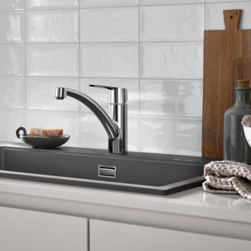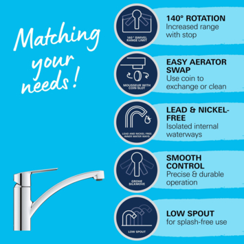 De iconische keukenfavoriet GROHE Start eengreeps keukenkraan is opnieuw ontworpen om het gebruik nog aangenamer en gemakkelijker te maken en vormt hierdoor een ideale upgrade. Deze designklassieker is opgefrist om te voldoen aan de eisen van moderne keukens en heeft nu een slank, modern profiel en beschikt over meer gebruikscomfort. Deze keukenkraan is ontworpen voor eengatsinstallatie en de lage uitloop kan soepel 140° worden gedraaid, wat meer flexibiliteit biedt aan de spoelbak zonder dat je op de muren spettert. De mousseur kan eenvoudig worden verwisseld met behulp van slechts een muntje – er komt dus geen gereedschap aan te pas. Binnenin zorgt de technologie van het GROHE SilkMove ES-cartouche voor een levenslange soepele en nauwkeurige bediening terwijl GROHE Zero geïsoleerde binnenwaterwegen ervoor zorgt dat je drinkwater lood- en nikkelvrij is. Een instelbare debietbegrenzer bespaart water en geld terwijl een geïntegreerde temperatuurbegrenzer verbranding voorkomt. De glanzende GROHE StarLight chroom afwerking is krasbestendig en zorgt voor een oogverblindend oppervlak dat lang meegaat. Met de GROHE QuickFix Plus-set kan de keukenkraan eenvoudig en snel worden geïnstalleerd, zonder dat je gereedschap nodig hebt. Voor deze kraan wordt een minimale druk van 1,0 bar aanbevolen.