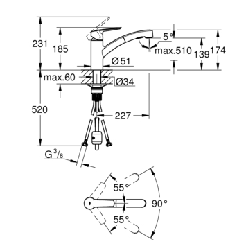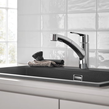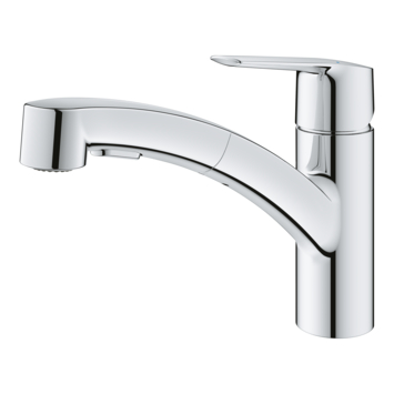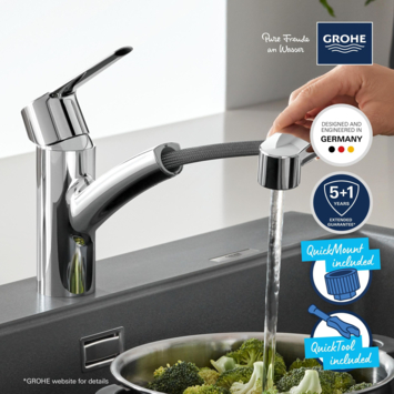 De GROHE Start eengreeps keukenkraan is de perfecte manier om met gemak een nieuwe stijl en verbeterde functionaliteit toe te voegen aan je keuken. Deze designklassieker is opgefrist om te voldoen aan de eisen van moderne keukens en heeft nu een slank, modern profiel en beschikt over meer gebruikscomfort. Deze keukenkraan is ontworpen voor eengatsinstallatie. De lage uitloop is voorzien van een Pull-Out Dual Spray die je maximale bewegingsvrijheid geeft en met één druk op de knop schakelt tussen een spatvrije laminaire straal en een krachtige Jet Spray –deze handige sproeikop zorgt dat je met gemak groenten afspoelt, pannen vult of de spoelbak schoonmaakt. De kraan keert automatisch terug naar de laminaire straal, wanneer deze wordt uitgeschakeld. De uitloop kan ook soepel 90° worden gedraaid voor extra gemak in krappe ruimtes. De technologie van het GROHE SilkMove cartouche zorgt voor een levenslange soepele en nauwkeurige bediening terwijl GROHE Zero geïsoleerde binnenwaterwegen zorgt ervoor dat je drinkwater lood- en nikkelvrij is. Een instelbare debietbegrenzer bespaart water en geld terwijl een geïntegreerde temperatuurbegrenzer verbranding voorkomt. De glanzende GROHE StarLight chroom afwerking is krasbestendig en zorgt voor een oogverblindend oppervlak dat lang meegaat. Met de GROHE QuickFix Plus-set kan de keukenkraan eenvoudig en snel worden geïnstalleerd, zonder dat je gereedschap nodig hebt. Voor deze kraan wordt een minimale druk van 1,0 bar aanbevolen.