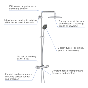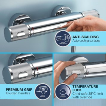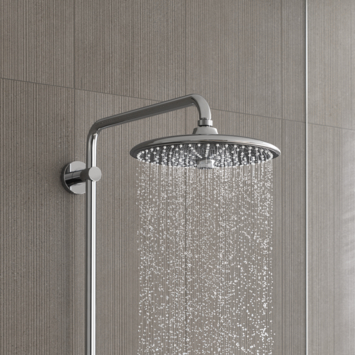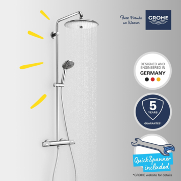 Transformeer je douchebeleving met de Grohe Quickfix Vitalio Joy 260 regendoucheset in chroom. Deze regendoucheset biedt een moderne uitstraling en geavanceerde functionaliteit, perfect voor elke badkamerupgrade. Met zowel de regendouchekop als de handdouche voorzien van drie straalstanden, heb je altijd de juiste instelling voor jouw ideale douche-ervaring. Of je nu een zachte regenstraal of een krachtige straal nodig hebt, deze set levert het allemaal. De thermostaatkraan zorgt ervoor dat je eenvoudig de gewenste watertemperatuur kunt instellen, voor een comfortabele en veilige douche. Dankzij de anti-kalk functie blijft je doucheset vrij van kalkaanslag, wat het onderhoud aanzienlijk vergemakkelijkt. De waterbesparende technologie draagt bij aan een lager waterverbruik zonder dat je concessies doet aan het comfort van je douche. Met de verstelbare handdouchehouder kun je de handdouche eenvoudig op de juiste hoogte zetten. De omstelknop maakt het makkelijk om tussen de regendouche en de handdouche te schakelen. De 150 cm lange anti-twist slang biedt de nodige bewegingsvrijheid en voorkomt dat de slang in de knoop raakt, zodat je ongestoord kunt genieten van je douche. De Grohe Quickfix Vitalio Joy regendoucheset komt met alle benodigde bevestigingsmaterialen, waardoor je de set snel en zonder gedoe kunt installeren. Deze set is de ideale keuze voor een stijlvolle en functionele upgrade van je badkamer.