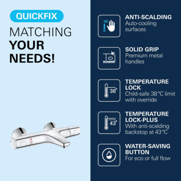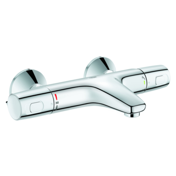 De Grohe Thermostatische Badkraan Precision Trend Chroom 15 cm past in iedere badkamer. Deze thermostatische badkraan zorgt voor een heerlijk bad of - door de automatische omschakeling - een heerlijke douche met een constante watertemperatuur, ook al zijn er fluctuaties in de waterdruk. De kraan is voorzien van GROHE TurboStat: hiermee wordt snel en continu de gewenste temperatuur bereikt. De kraan beschikt over GROHE CoolTouch®, waardoor het binnenkomende hete water wordt omspoeld door koud water en de buitenkant van de thermostaatkraan nooit warmer wordt dan de temperatuur van het douchewater. Met de SafeStop knop op 38°C voorkom je dat je kinderen de temperatuur verhogen, terwijl je dankzij de volumegreep met GROHE EcoButton tot 50% water kunt besparen. De robuuste ergonomisch gevormde metalen grepen zorgen tevens voor een optimale grip.