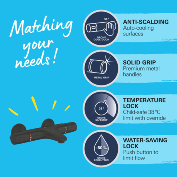 Met Grohe CoolTouch blijft de thermostaat altijd koel aanvoelen, zodat je je nooit kunt verbranden. De Grohe SafeStop veiligheidsknop voorkomt dat de temperatuur hoger wordt dan 38°C, een geruststellende extra voor gezinnen met kinderen. Bij koudwateruitval zorgt de automatische uitschakeling ervoor dat de waterstraal wordt beperkt, zodat je veilig kunt blijven genieten.
