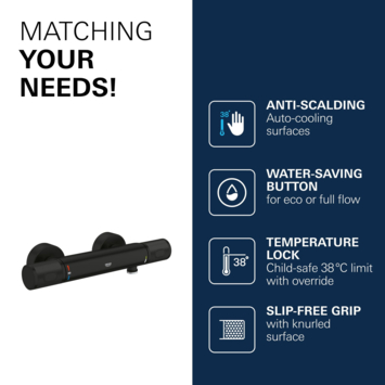 De matzwarte afwerking geeft een stoere, moderne look aan je badkamer. Dankzij het duidelijke montageconcept en eenvoudige bediening blijft de kraan jarenlang probleemloos in gebruik. Met de GROHE Precision Feel thermostatische douchekraan haal je een perfecte combinatie van stijl, veiligheid en comfort in huis.