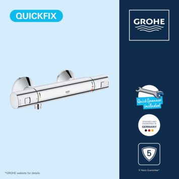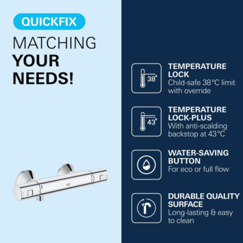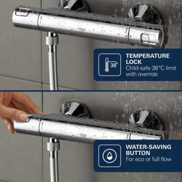 De GROHE TurboStat-technologie reageert direct en zorgt dat het water razendsnel op de gewenste temperatuur is. Met de ingebouwde SafeStop-knop op 38°C voorkom je dat de temperatuur per ongeluk te heet wordt: ideaal in gezinnen met kinderen. Zo douche je ontspannen en zonder zorgen.