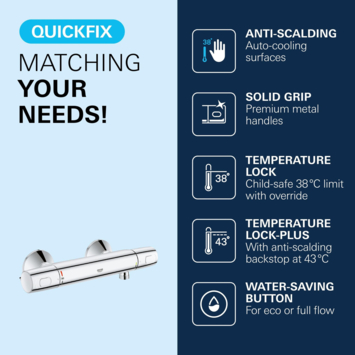 Veiligheid staat centraal: met GROHE CoolTouch wordt de binnenzijde van de kraan zo ontworpen dat heet water nooit direct de buitenmantel raakt. Zo blijft het oppervlak koel en verklein je het risico op verbranding. De ingebouwde SafeStop-functie begrenst de temperatuur standaard op 38°C, wat extra geruststelling biedt als kinderen de douche gebruiken.
