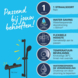 Extra veiligheid is aanwezig dankzij SafeStop op 38°C, optioneel uit te breiden met SafeStop Plus op 43°C. Bij plotseling wegvallen van koud water beperkt de automatische veiligheidsuitschakeling de toevoer. De montage kan zowel geschroefd als gelijmd worden uitgevoerd, en de bovenste beugel is in hoogte verstelbaar. Minimale waterdruk: 1,0 bar.