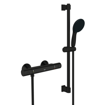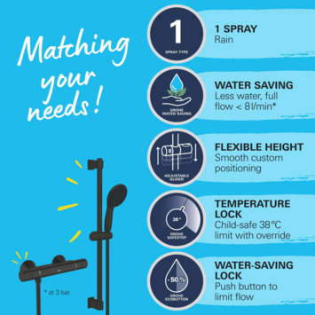 Ervaar iedere dag een comfortabele douche met de GROHE Vitalio Start doucheset Precision Start met thermostaatkraan in mat zwart. De set is volledig uitgerust voor een complete douche-ervaring: van de thermostatische kraan voor constante temperatuur tot de Vitalio Start 110 handdouche met ontspannende Rain Spray.