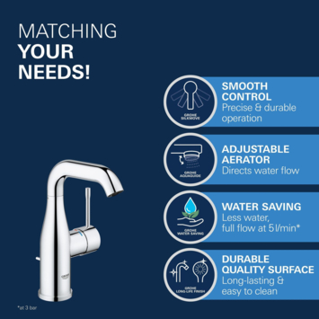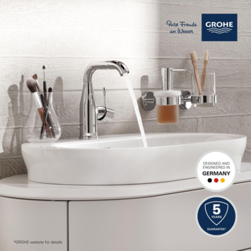 Met GROHE wastafelkraan Essence M-size met hendel en waste Chroom heb je veel ruimte bij je wastafel door de medium hoge uitloop van 19,3 cm. Ook de 360° draaibare uitloop geeft je extra ruimte, comfort en flexibiliteit. Met de eenhendelbediening zet je gemakkelijk met 1 hand de kraan aan. Door de GROHE SilkMove keramische schijven stel je vooraf soepel en nauwkeurig de temperatuur in. Ook kun je daarmee exacter het watervolume regelen. Bovendien vergen deze keramische schijven weinig onderhoud. Dankzij de ingebouwde GROHE EcoJoy Technologie bespaar je flink op je waterverbruik: zelfs met een volle waterstraal verbruik je slechts maximaal 5,7 l/min! De AquaGuide mousseur is draaibaar, zo voorkom je gespetter over je wastafel heen. Met de hendel van de trekwaste aan de achterzijde van de kraan zet je eenvoudig het afvoer open of dicht. Met je handen in te heet of vies water is voorgoed verleden tijd! De installatie van de kraan doe je eenvoudig zelf met het vereenvoudigde GROHE QuickFix snelbevestigingssysteem. Met de meegeleverde flexibele aansluitslagen, waste en wasteinrichting, afvoerplug, bevestigingsmateriaal en montagehandleiding kom je niets tekort! De kraan geeft met zijn U-vormige uitloop op een flesvormige basis een ingetogen retro uitstraling aan je interieur. De GROHE StarLight chromen afwerking is bestendig en blijft met het juiste onderhoud jaren glanzend mooi in je badkamer. Besluit je deze kraan te kopen? Dan profiteer je van 5 jaar fabrieksgarantie. De kraan is ook verkijgbaar in de kleuren supersteel (RVS), Cool Sunrise (geborsteld messing), Nickel (geborsteld nikkel), Warm Sunset (geborsteld koper) en Hard Graphite (geborsteld grafiet). Zo kies je altijd de juiste kleur naar jouw smaak!