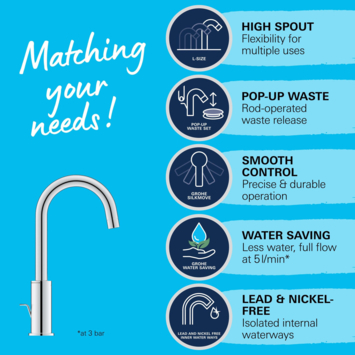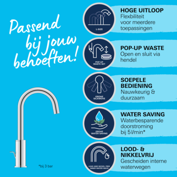 De praktische pop-up waste is eenvoudig te bedienen via een hendeltje aan de achterkant van de kraan, waardoor je handen altijd droog blijven. De hoge, buisvormige draaibare uitloop biedt extra flexibiliteit, zodat je moeiteloos de kraan kunt gebruiken voor allerlei taken. Dankzij de Grohe SilkMove keramische cartouche geniet je van duurzame, nauwkeurige regeling van het watervolume en de temperatuur via de stevige metalen hendel.