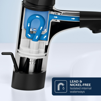 De push-open afvoer maakt het openen en sluiten van de waste eenvoudig met één vingertip. Geïsoleerde interne waterwegen zorgen ervoor dat het water veilig en vrij van lood en nikkel blijft. Zo geniet je dagelijks van comfort en gebruiksgemak in je badkamer.