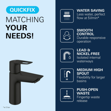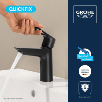 Het matzwarte design geeft een moderne en stijlvolle look. Installatie is eenvoudig dankzij het één-gat systeem en de duidelijke instructies via QuickTool, QuickGuide en QuickVideo. Met de GROHE Start Loop M-Size push-open kies je voor een kraan die praktische functies, een krachtige waterstraal en een mooie uitstraling moeiteloos combineert.