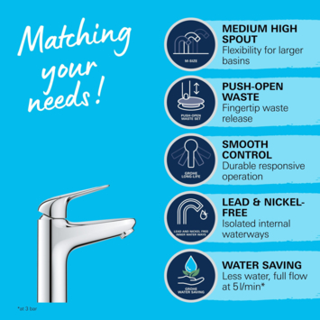 Met de innovatieve Grohe Zero technologie weet je zeker dat het water nooit in aanraking komt met lood of nikkel, zodat je altijd geniet van schoon en veilig water. De kraan is bovendien voorzien van een praktische push-open waste, waarmee je de afvoer eenvoudig opent en sluit met een lichte druk.