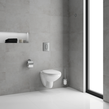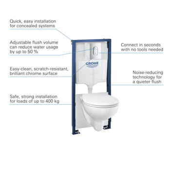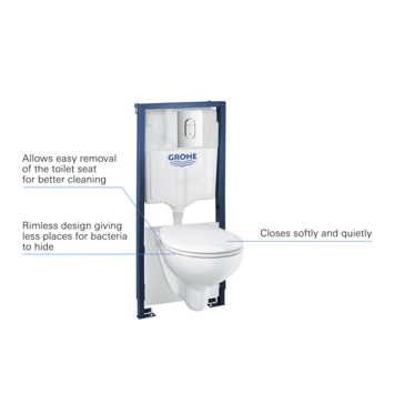 Het Grohe Wc-pack Bau Arena 4 in 1 is een complete set waarin alles zit wat je nodig hebt: een hangtoilet en de stijlvolle bedieningsplaat met een glanzende GROHE StarLight chroom afwerking. Dankzij het GROHE QuickFix systeem kun je de wc in een handomdraai aan een wand of tussen een systeemwand plaatsen. Getest en gecertificeerd voor een belastbaarheid van ruim 400 kg. Het frame is stabiel en kun je veilig thuis ophangen. Je hebt geen gereedschap nodig om de slang, revisieschacht en watervoorziening aan te sluiten. Met een hangtoilet met verborgen waterreservoir zal het eenvoudiger dan ooit zijn om je badkamer te reinigen. Doordat de wc randloos is, kunnen bacteriën niet achterblijven. Hierdoor maak je de wc zo schoon en spoelt hij beter door. De zitting gaat langzaam naar beneden voor extra stilte en veiligheid. Ook kun je de zitting in enkele simpele stappen verwijderen. GROHE Whisper geluiddemping vermindert het geluid van het spoelen en voorkomt dat het wordt overgedragen naar aangrenzende kamers. Dankzij GROHE EcoJoy dual-flush bespaar je bij het doorspoelen tot wel 50% op je waterverbruik. Deze GROHE Solido set tilt het comfort in jouw badkamer naar een hoger niveau.
