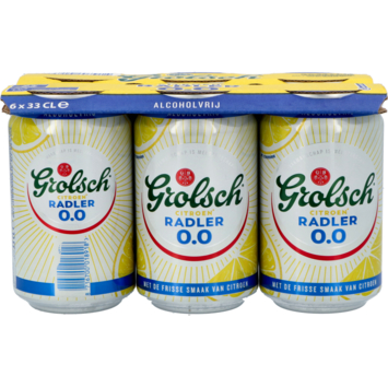 6 x 33 cl blikjes scherp geprijsde Grolsch radler 0.0%. De getoonde prijs is exclusief statiegeld voor blikjes.
