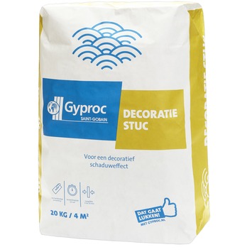 Gyproc decoratie stuc is speciaal ontwikkeld gips om fraaie schaduweffecten mee te creëren op bijvoorbeeld uw plafond. De decoratie stuc kan worden toegepast op gipsplaten, metselwerk, beton, kalkzandsteen, gasbeton- en gipsblokken en is geschikt voor laagdiktes van 5 tot 20 mm. Bedoeld als toplaag: verf en latex kunnen de schaduweffecten teniet doen. 20 kilo is genoeg voor 4 m2 bij 5 mm laagdikte.