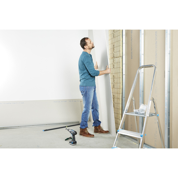 Met deze Gyproc gipsplaat 12,5 mm AK maak je in een handomdraai een strakke wand of plafond. Door de afgeschuinde kant (AK) is de plaat simpel strak af te werken. Schoef de plaat vast op het schuine gedeelte van de plaat, plak de naad af met wapeningsband en vul vervolgens met een voegenvuller en finisher. Door deze manier van afwerken is schade aan je gipsplaat tijdens de klus ook minder vervelend. Door de afgeschuinde kant is schade na het afwerken niet meer zichtbaar en heb je een strak eindresultaat.