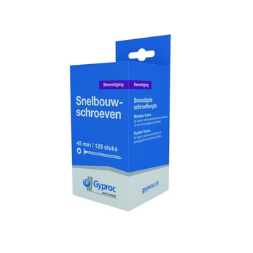 Met Gyproc Snelbouwschroeven bevestig je onder meer gipskartonplaten op eenvoudige en snelle wijze tegen een metalen Gyproc frame, bestaande uit Gyproc Staanders en Gyproc Liggers. Niet alleen zijn snelbouwschroeven voor uiteenlopende platen geschikt, zoals Gyproc Wandplaten, Gyproc Badkamerplaten en Gyproc Plafondplaten, ook kunnen ze worden bevestigd zonder voor te boren. De schroeven zijn namelijk voorzien van een geharde punt. Om Gyproc Snelbouwschroeven altijd op de juiste diepte in te draaien, kunt u gebruik maken van een Gyproc Schroefkop. De snelbouwschroeven hebben een lengte van 45mm en zijn verpakt in een doosje van 125 stuks. Kortom, met de corrosiebestendige snelbouwschroeven schroeft u platen gegarandeerd stevig vast.